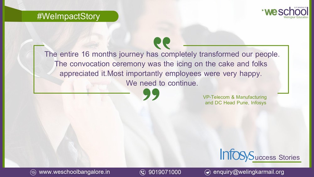 Infosys BPO, a 100% subsidiary of Infosys Ltd is one of the largest BPO’s in the country. The current revenues of the company stand at $800 million. Weschool, Bangalore started its Management Development Centre in October 2007. Prof. AKN Prasad joined Weschool as the Head of the Centre with a mandate to build and grow the center’s activities. Prof. Prasad had garnered comprehensive operational knowledge of the challenges faced by BPO’s and their entry-level executives with his experience at Optimus – a Polaris BPO company which he headed before joining WeSchool. Prof. Prasad approached the Infosys BPO with a plan to create an Executive Program to help develop their entry-level executives, the Infosys BPO accepted the proposal and provided a contract for a 16 to 18 month, 400-hour Management Program called JMLP (Junior Management Leadership Program), based on the course structure and design provided by MDC under Prof. Prasad’s guidance. The idea behind the program is to control attrition, provide holistic management education to graduates and build a mid-level leadership pipeline in the organization. The two initial batches were launched in February 2009 at their Bangalore center. The 3rd and 4th batch were launched 6 months later at their Pune center. There have been continuous launches of JMLP programs ever since. JMLP graduates have performed very well in their assigned roles and have also moved up the corporate ladder to assume greater responsibilities. JMLP, designed and delivered by MDC WeSchool is one of the biggest success stories in the corporate executive development program.